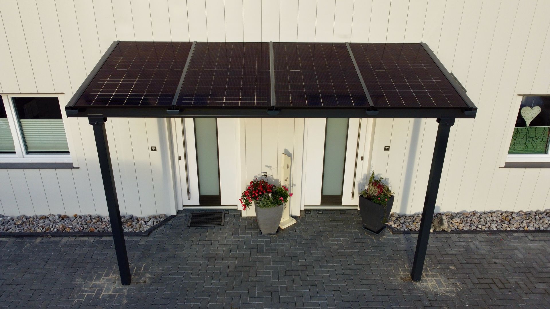 Mit einer Solarterrassenüberdachung haben Sie Ihre eigene Stromversorgung integriert in ihrem Terrassendach.